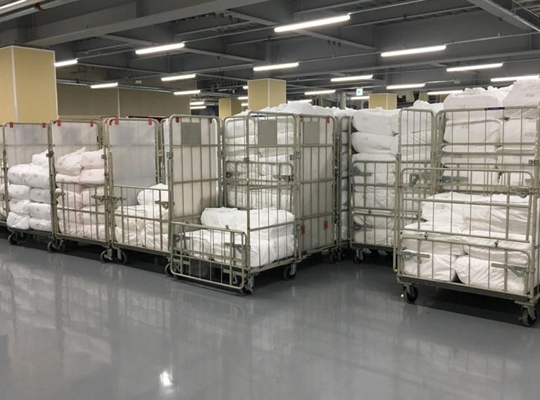 回収した使用済みのシーツ類は、シーツ、毛布などざっくり種類別に分けておく。